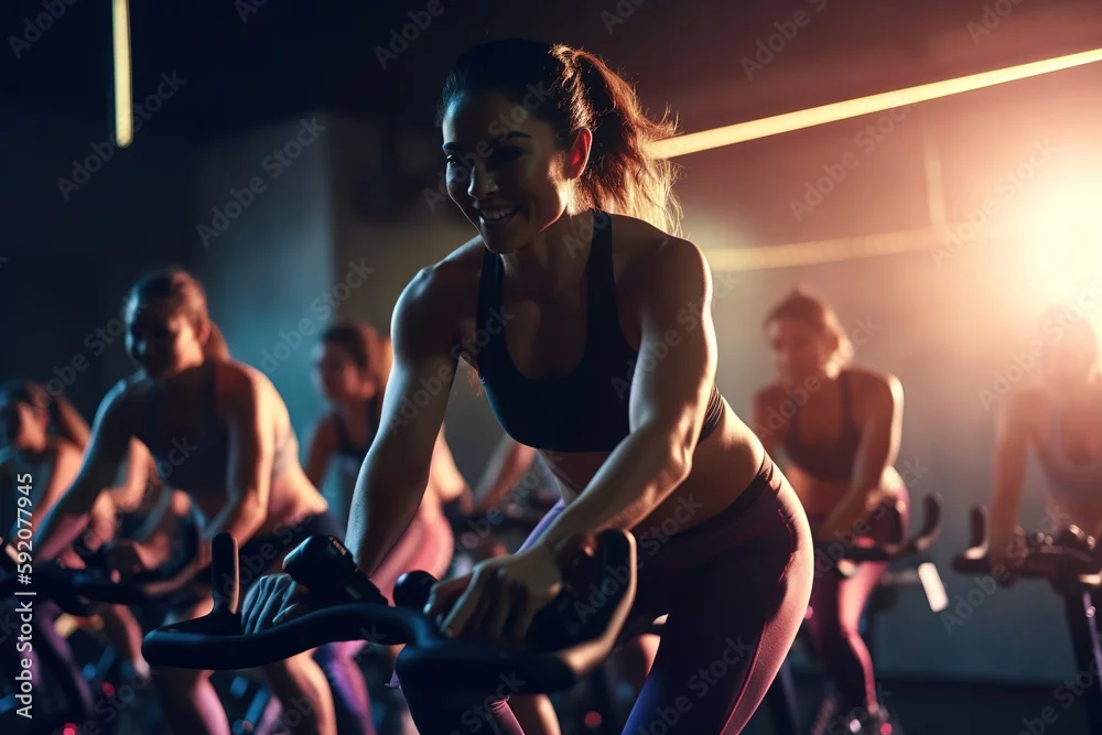 Obraz A motivational, group fitness class , featuring participants engaged in an energetic workout, such as spinning, aerobics, set against a vibrant, gym studio background. Generative AI