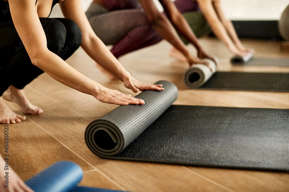 Obraz Close-up of athletic women roll their exercise mats after sports training in gym. - do siłowni - Picturewall.pl