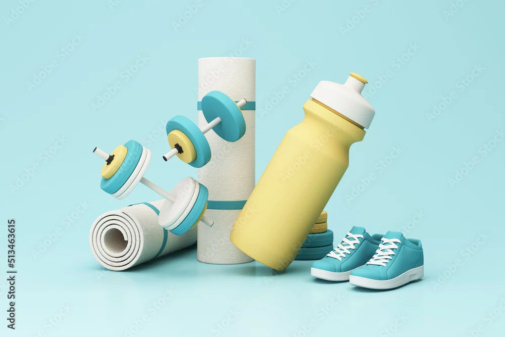 3D render illustration, sport fitness equipment, male and female concept, yoga mat, bottle of water, dumbbells, weights, with Fitness shoes and isolate on pastel background. 3d render