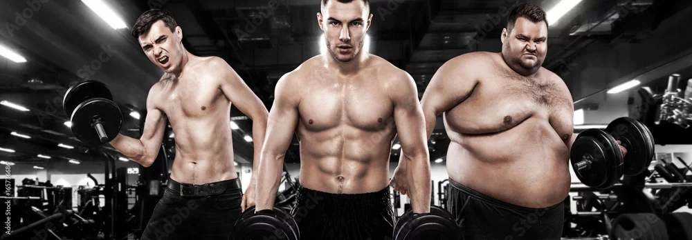 Obraz Grubi, wysportowani i wysportowani mężczyźni. Ektomorf, mezomorf i endomorf. Przed i po wyniku. Grupa trzech młodych mężczyzn sportowych - modele fitness trzyma hantle w siłowni.