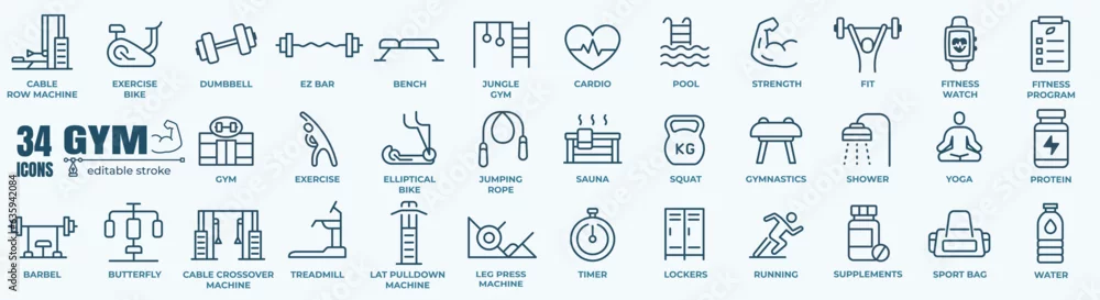 Gym equipment and fitness icon set. Containing healthy lifestyle, weight training, body care and workout or exercise equipment icons. Solid icons vector collection.