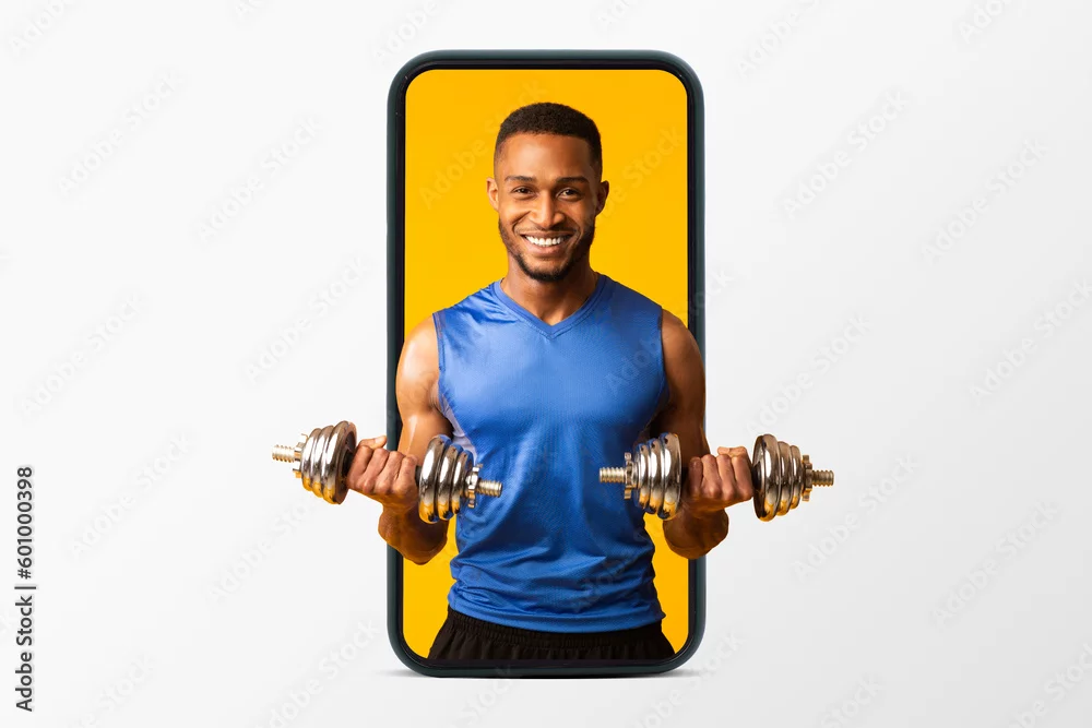 Obraz Happy millennial african american muscular guy in sportswear doing exercises with dumbbells - do siłowni - Picturewall.pl
