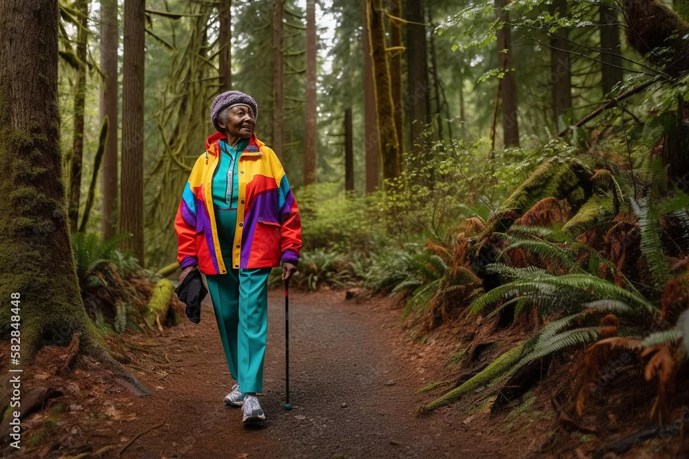 Obraz Mature black woman hiking in the forest wearing colorful track suit for her walk. generative AI - do siłowni - Picturewall.pl