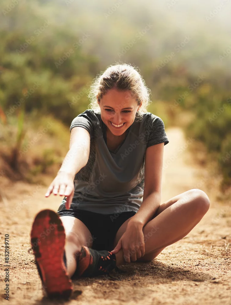Obraz Path, woman or runner stretching legs in nature for fitness training, wellness or exercise outdoors. Happy, trail or healthy female athlete in body warm up to start running and cardio workout on hill