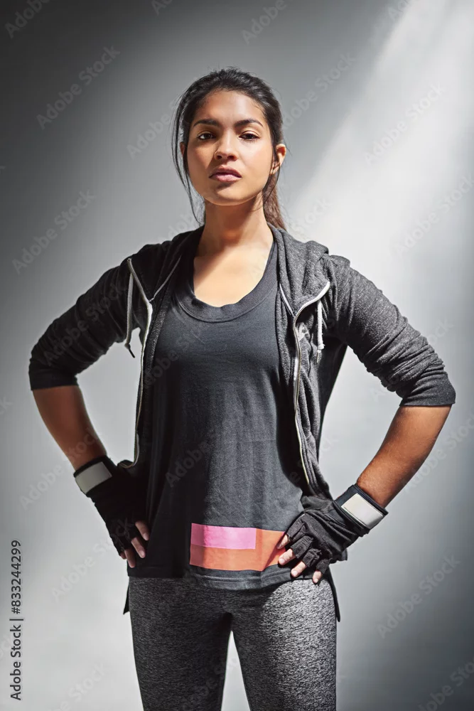 Obraz Portrait, woman and confidence for fitness and empowerment, serious and light on gray background. Workout, strong and exercise for athlete person, gloves and training in studio for personal trainer