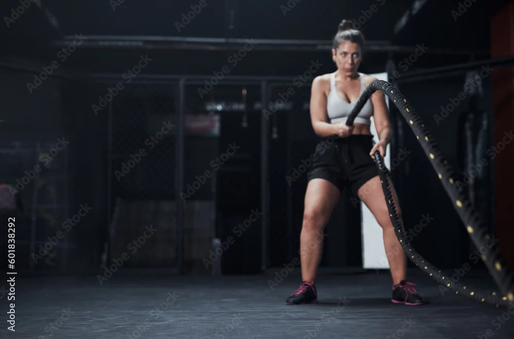 Sports, battle ropes and woman at the gym doing strength, cardio and challenge exercise with space. Fitness, energy and strong female athlete doing health workout or training with equipment for power