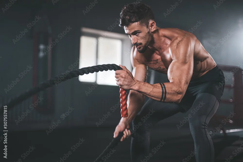 Obraz Taking photo from the front of athletic guy in a dark cross fit class he started his training exercises get sweating - do siłowni - Picturewall.pl