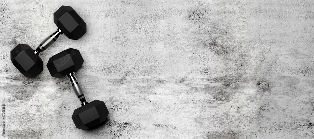 Obraz Two fitness gym hexbells or dumbbells with chrome handle and black weights over concrete floor background flat lay top view from above, muscle exercise, bodybuilding or fitness concept