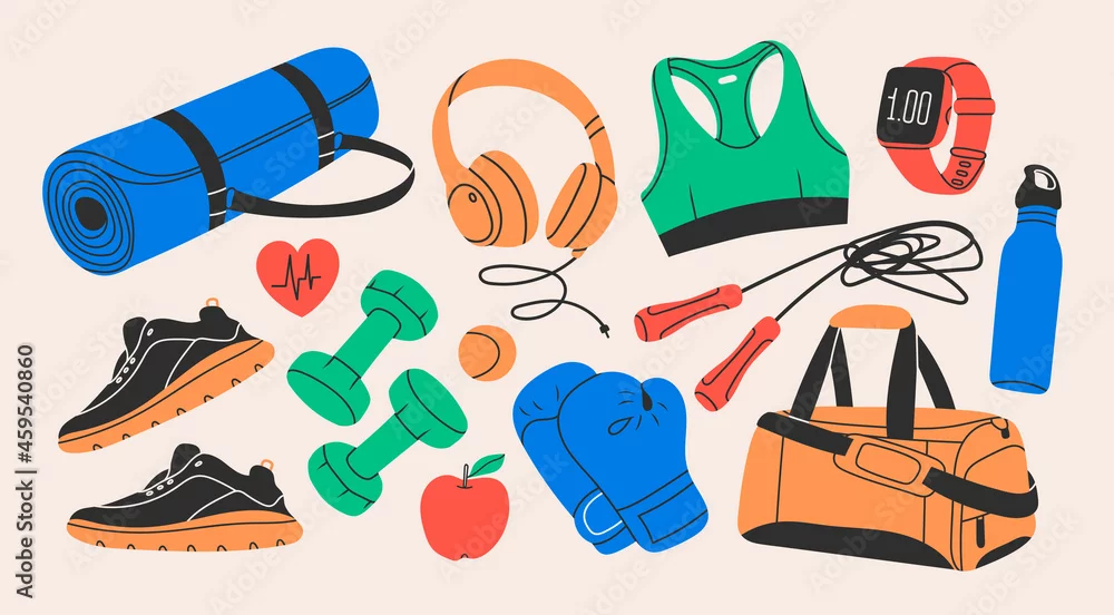 Obraz Various Sport equipment. Fitness inventory, gym accessories. Dumbbells, fitness tracker, headphones, bottle, jump rope, shoes, mat, boxing gloves. Healthy lifestyle concept. Hand drawn Vector set - do siłowni - Picturewall.pl