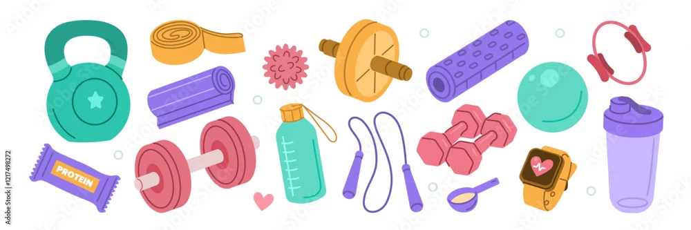 Weight training, yoga, pilates stickers set. Dumbbells, protein supplements, kettlebell, jump rope and other fitness elements. Modern cartoon concept. Vector illustration.
