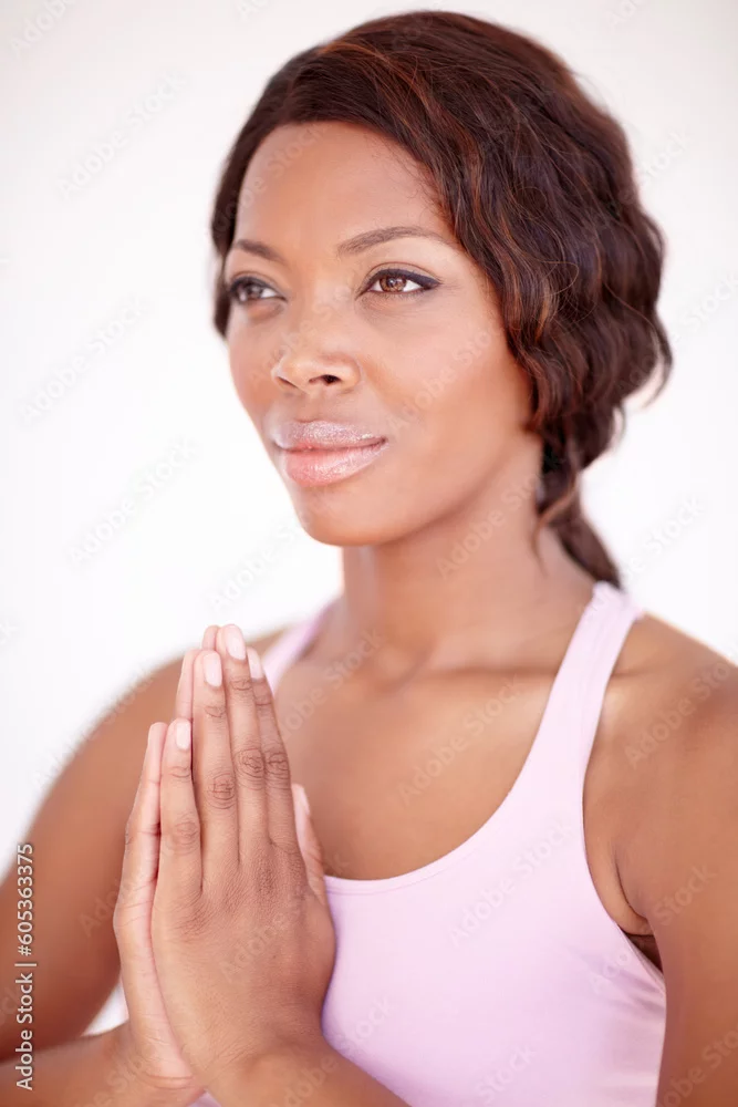 Woman, praying hands and yoga for peace in studio with gratitude, focus and breathing by white background. Girl, prayer sign and zen vision for wellness, mindfulness and spiritual health by backdrop