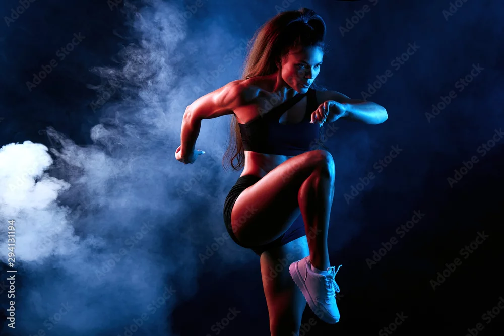 Young serious confident attractive sporty girl runner in shorts and top keeps her leg raised while warming up and stretching indoors. isolated black background, lifestyle