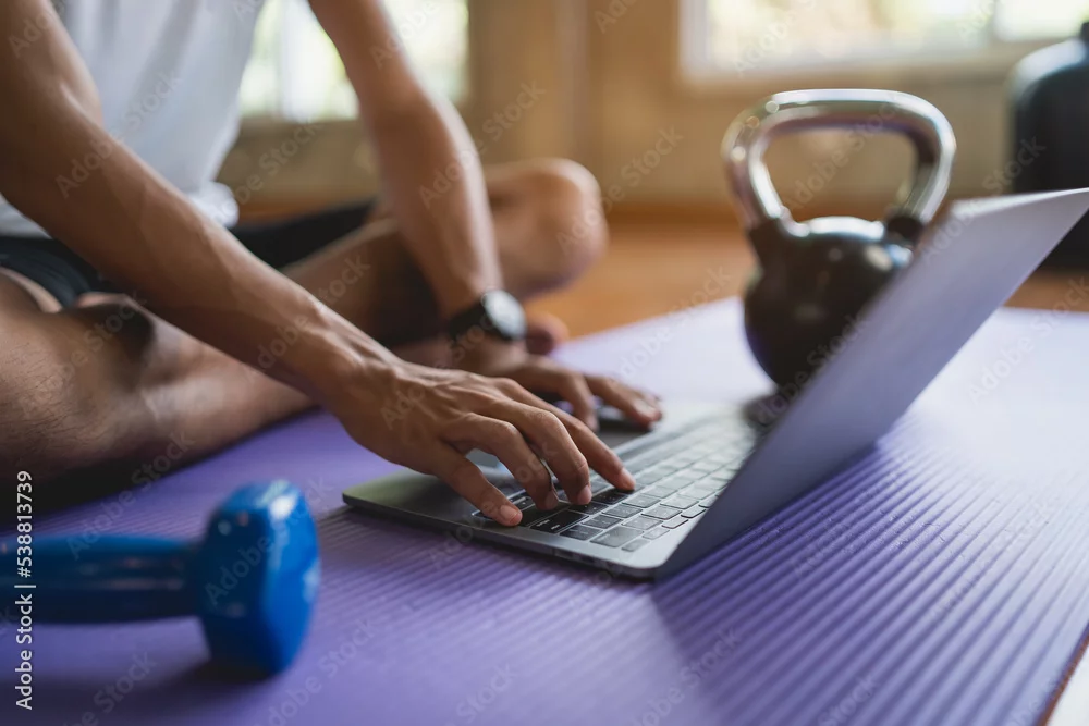 Young sportsman sitting on purple yoga mat and doing exercise sports workout online and looking video streaming on laptop indoor at the fitness gym. Online fitness training from gym concept.