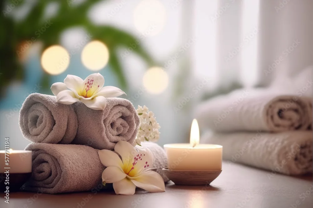AI Generative image, spa accessory composition set in spa hotel , beauty wellness center . Spa product are placed in luxury spa resort room , ready for massage therapy . Sublime Generative AI image .