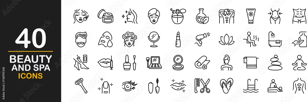 Beauty and spa icon set. Spa treatments. Cosmetics services. Concept of a healthy lifestyle, face and body care, recreation. Contains such icons as massage, sauna, cosmetology, skin care and more