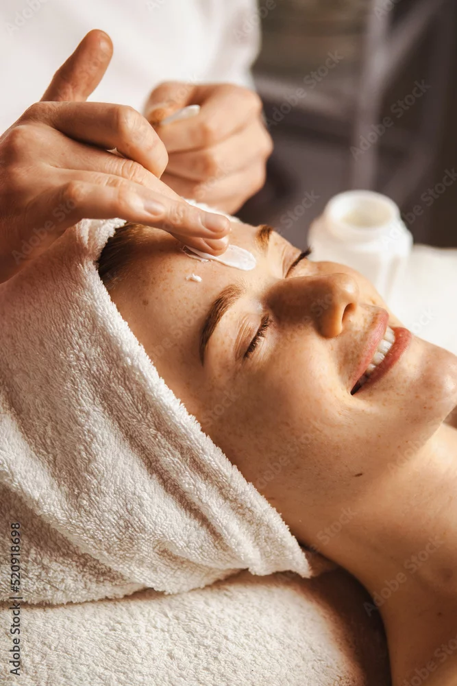 Close-up portrait of woman getting spa facial massage treatment with moisturising cream at beauty spa salon. Natural skin care cosmetic. Health care, beauty