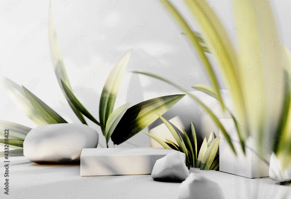 Obraz 3D render podium, showcase on light white background with shadows in green tropical leaves of plants. Abstract natural,organic background for advertising products, spa body care, relaxation, health.