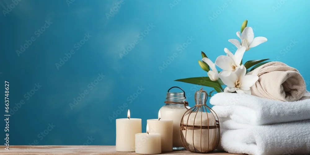Eco friendly spa relax composition with mockup of natural beauty products, candle and spa accessories on blue background with white flowers. Wellness and skin care treatment.