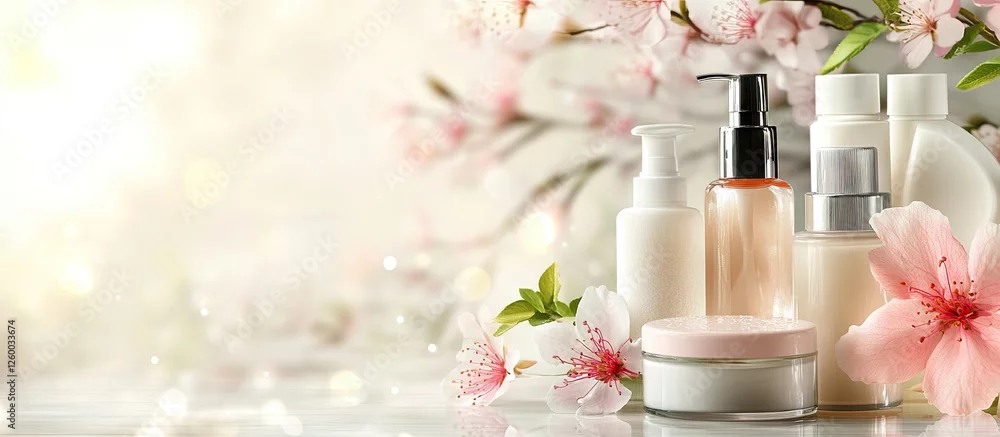 Obraz Elegant display of skincare products in soft pastel colors with pink flowers on a light background, representing medical spa treatments and beauty care.