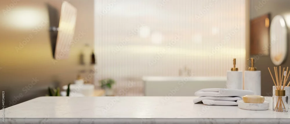 Obraz Marble tabletop with toiletry and mockup space over blurred elegance bathroom interior - do SPA - Picturewall.pl