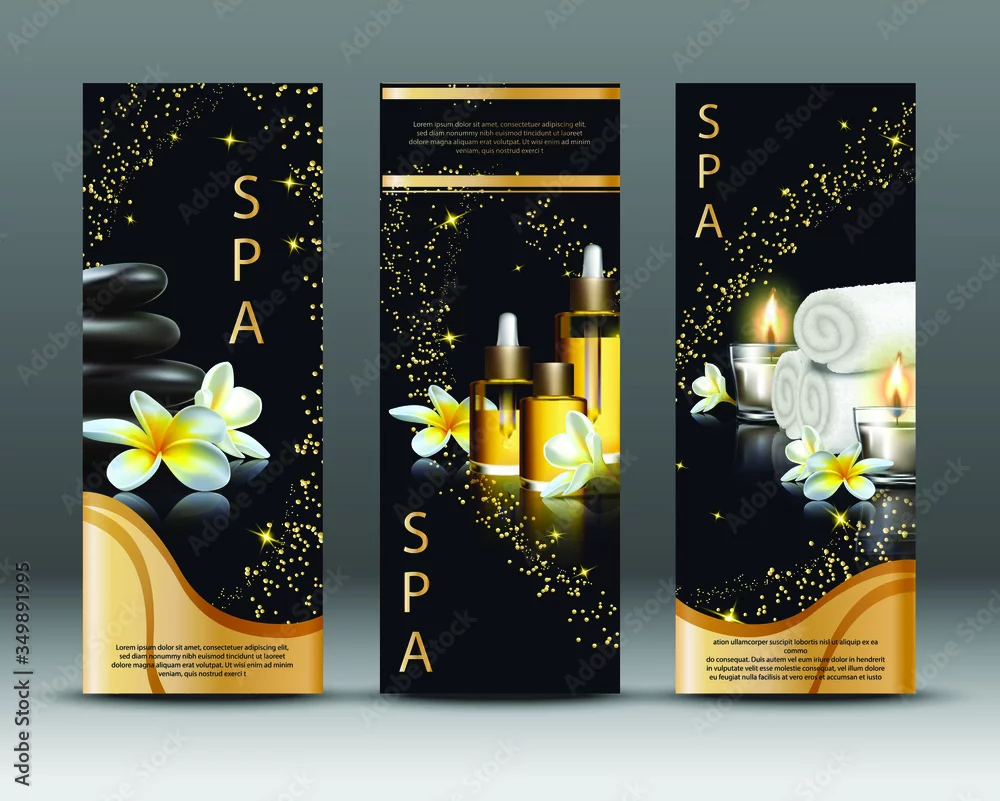 Spa composition with realistic elements spa treatments with white towel, massage and essential oils, candles and exotic flowers on black background. Vertical flyer for your spa salon.