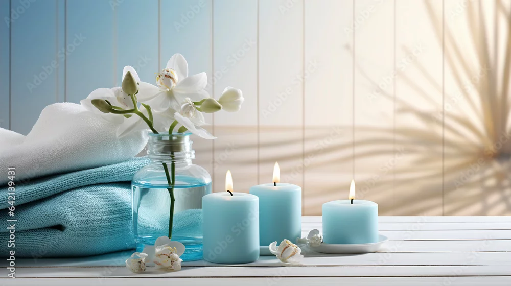Spa salon light blue composition in wellness center. Spa still life background with aromatic candle, orchid flower and towel. Beauty spa treatment and relax. Relaxing background.