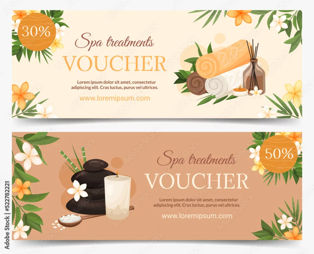 Spa treatments discount voucher set horizontal template. Coupon certificate for a spa salon, beauty salon, beauty services. Vector illustration design for promotion banner, gift card