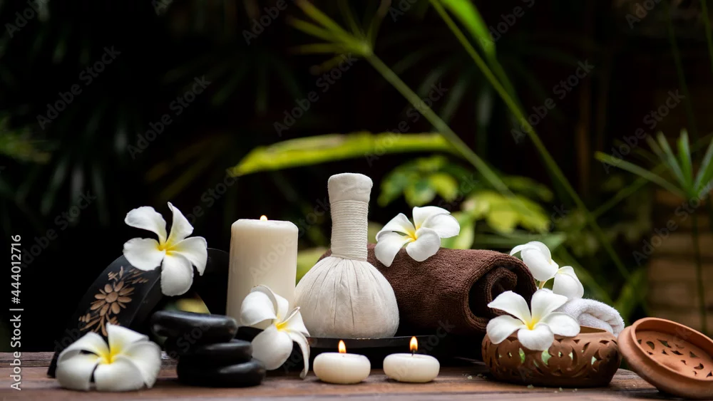 Thai spa massage. Spa treatment cosmetic beauty. Therapy aromatherapy for care body women with candles for relax wellness. Aroma and salt scrub setting ready healthy lifestyle.