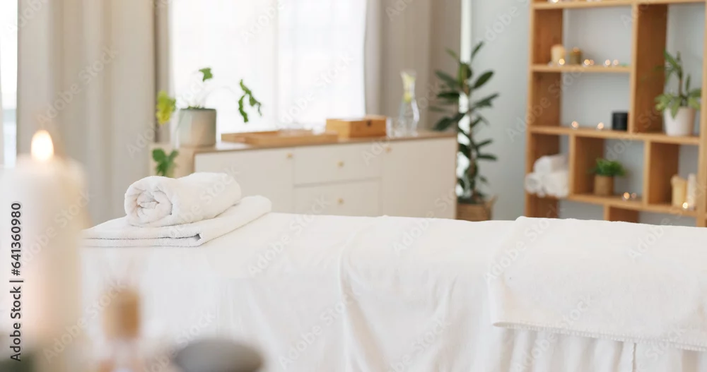 Wellness, relax and a massage table on an empty spa background for luxury wellness or treatment. Health, zen and hospitality with candles for peace or aromatherapy a room of a modern beauty salon