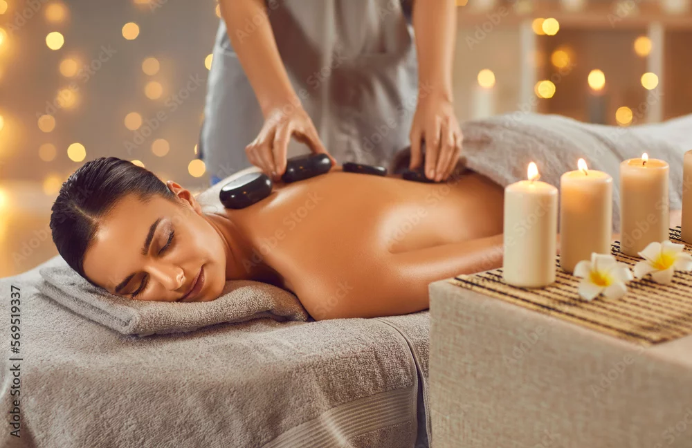 Woman enjoying exotic hot stones spa massage. Relaxed young woman lying on a spa bed while the masseuse is putting hot stones on her back. Spa treatment concept