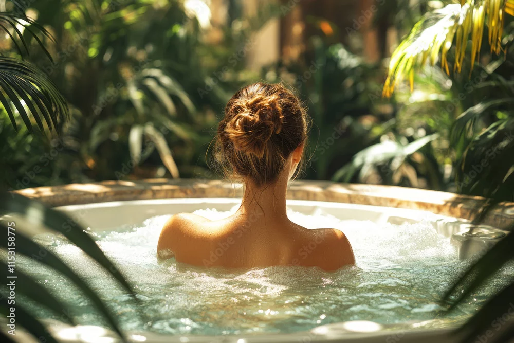 Obraz Woman receiving hydromassage in verdant tropical setting, experiencing serene wellness amid lush greenery and tranquil spa environment