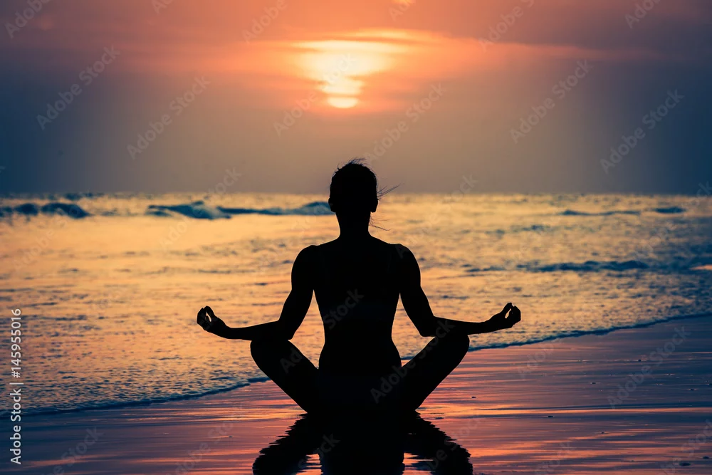 Obraz Kobieta ćwicząca jogę przy zachodzie słońca
