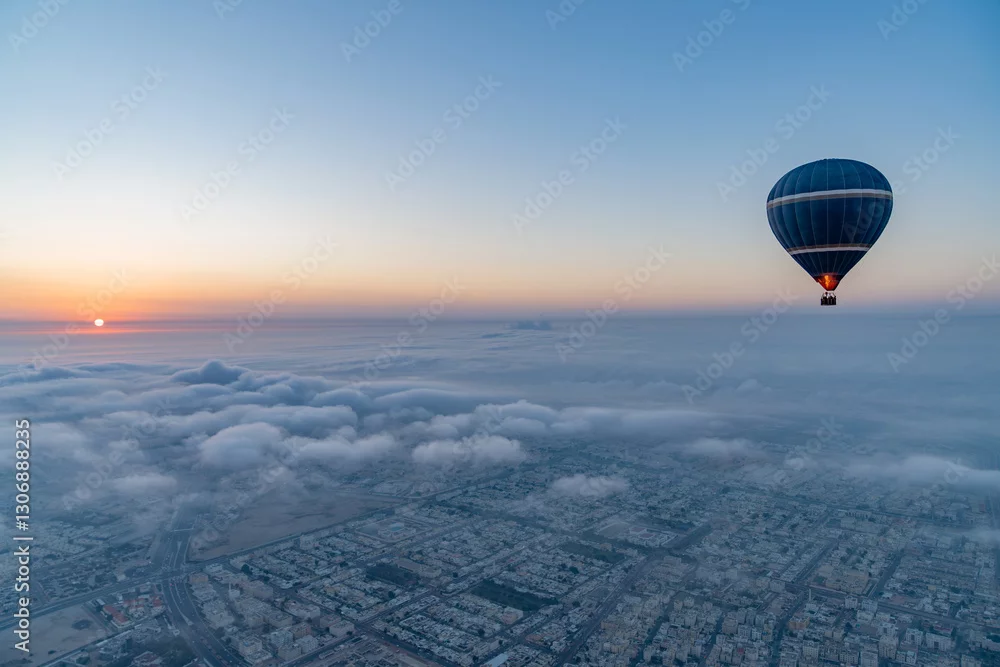 Obraz Lot balonem na ogrzane powietrze nad miastem o wschodzie słońca