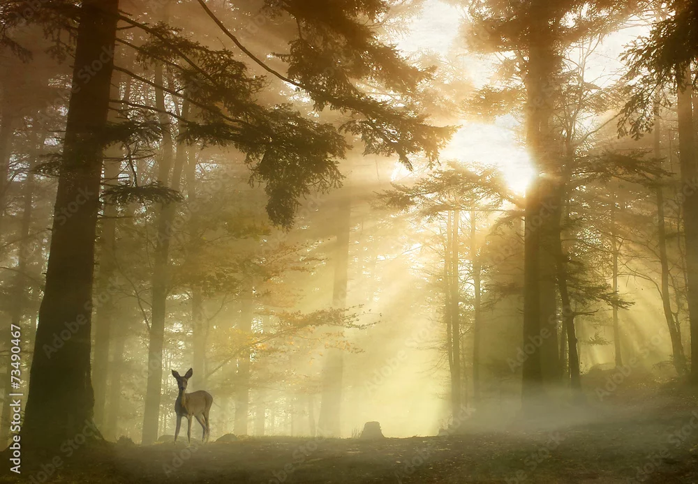 Obraz sarna w rozświetlonym, złocistym lesie
