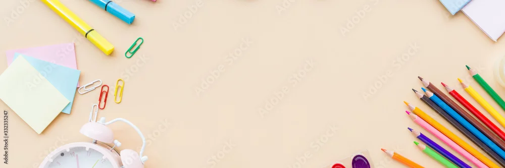 Obraz Back to School background with place for text. Horizontal banner for web design. Collection of school supplies in a bright flat style. Educational concept. Copy space, mockup, overhead, template.