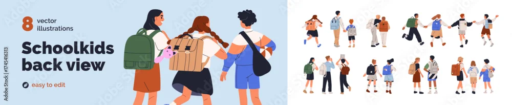 Obraz Back to school set. Rear view of kids students holding hands, walking together. Children groups, classmates, friends with backpacks from behind. Flat vector illustration isolated on white background.