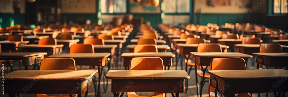 Obraz Empty Classroom. Back to school concept in high school. Classroom Interior Vintage Wooden Lecture Wooden Chairs and Desks. Studying lessons in secondary education. generative ai