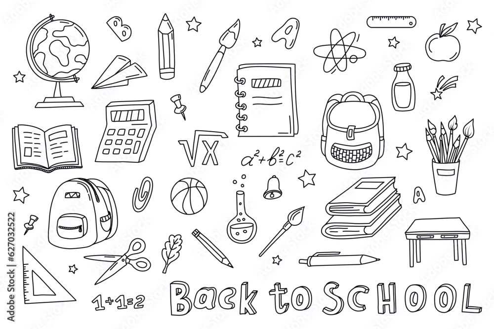 Obraz Hand drawn school supplies. Back to School concept. School object collection, doodle . Sketch icon set. Good for wrapping paper, stationery, scrapbooking, wallpaper, textile prints. Vector illustratio
