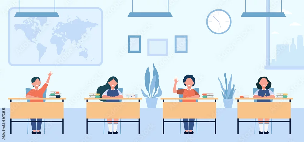 Happy pupils studying in classroom isolated flat vector illustration. Cartoon children characters sitting at tables in school lesson. Study, exam and interior clipart concept