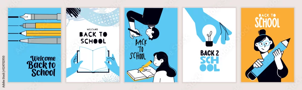 Set of back to school posters. Vector illustration concepts for graphic and web design, business presentation, marketing and print material. International education day, world book day, teachers day.