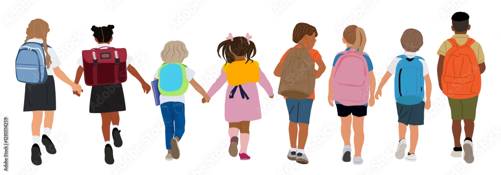 Set of school children, boys, girl going to elementary, primary school vector illustration isolated on transparent background. Happy pupils walking with backpacks rear view. Back to school concept.