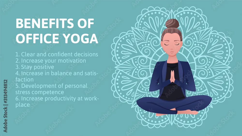 Business woman in blue suit is sitting in a lotus pose. Benefits of office yoga on hand drawn mandala background. The concept of business yoga Vector flat illustration
