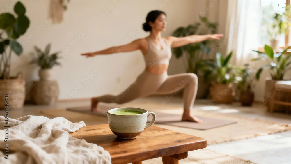 Concept of Health and Vitality with Menopause Support Drink and Matcha in Background, Woman Practicing Yoga in Spacious Room – Balance, Harmony, and Health Awareness