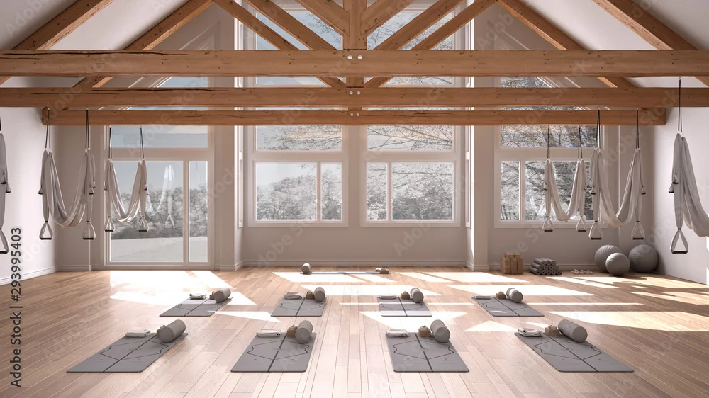 Empty yoga studio interior design, space with hammock, mats, pillows and accessories, wooden floor and roof, ready for yoga practice, meditation, panoramic window with winter panorama