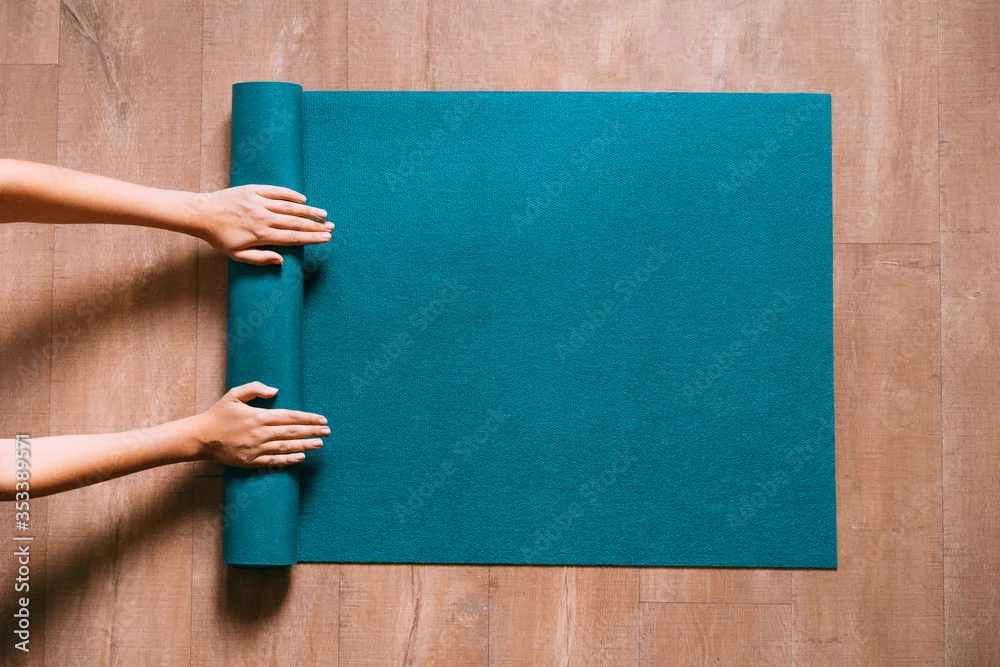 Obraz Fit woman folding blue exercise mat on wooden floor before or after working out in yoga studio or at home. Equipment for fitness, pilates or yoga, well being concept. Flat lay, space for text.