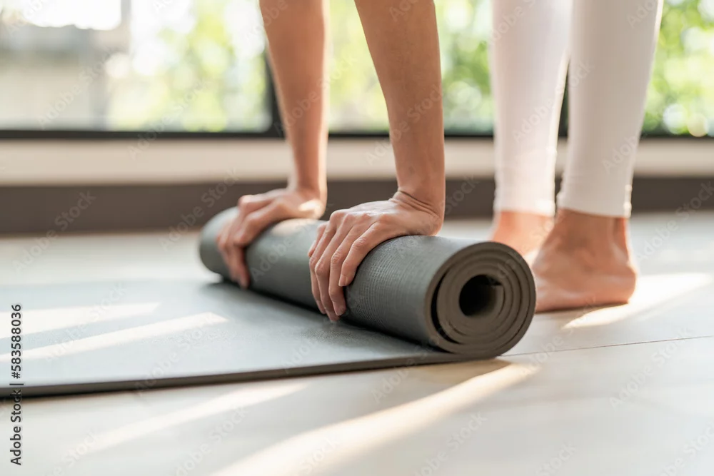 Obraz Fitness woman folding exercise mat before working out in yoga studio. rolling Yoga mat  after training healthy lifestyle. - do szkoły jogi - Picturewall.pl