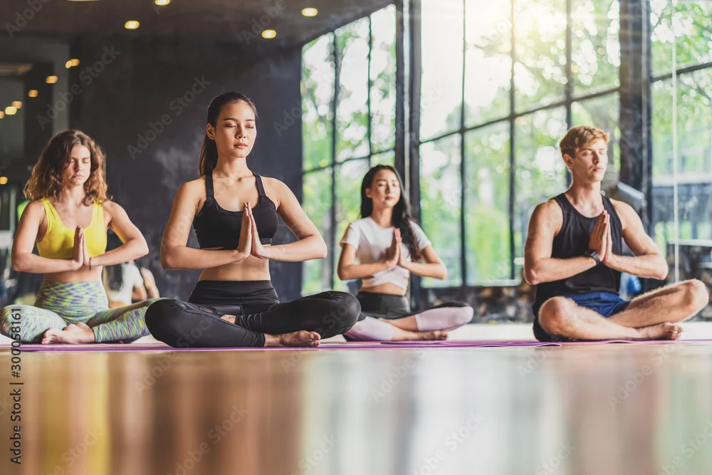 Obraz "Group of diversity practicing yoga class, healthy or Meditation Exercise,stretching in upward facing dog exercise, wearing sportswear bra and pants, sports and healthcare concept,." - do szkoły jogi - Picturewall.pl