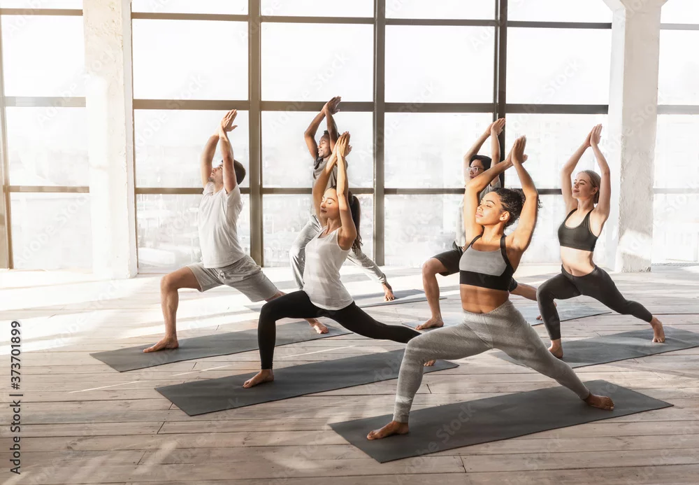Obraz Group Of Young Yoga Enthusiasts Training Together In Studio, Practicing Warrior Pose - do szkoły jogi - Picturewall.pl