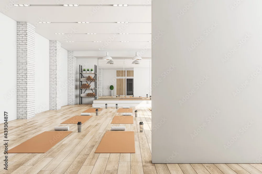 Modern concrete yoga gym interior with equipment, blank mockup space on wall, daylight and wooden flooring. Healthy lifestyle concept. Mock up, 3D Rendering.