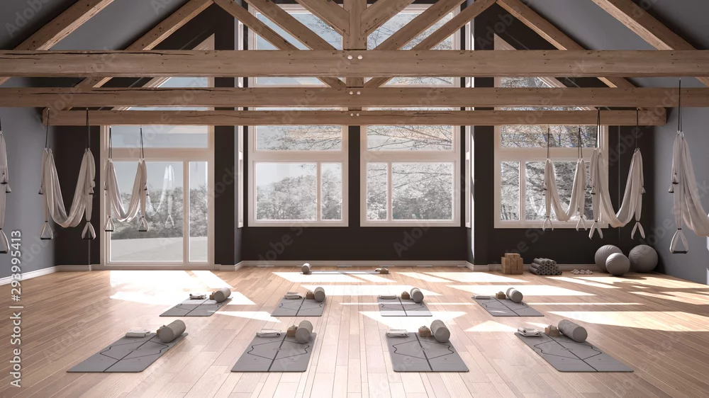 Puste wnętrze studia jogi, przestrzeń z hamakiem, maty, poduszki i akcesoria, drewniana podłoga i dach, gotowe do ćwiczeń jogi, medytacji, panoramiczne okno z zimową panoramą